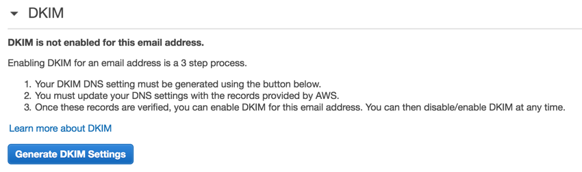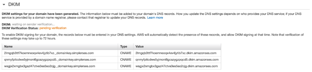 Once you have entered the CNAME records it can be a few hours before AWS confirms the DKIM Settings. You should receive an email when this happens. If you face any issues drop us an email with a screenshot of the records you entered and we'll help you get set up.